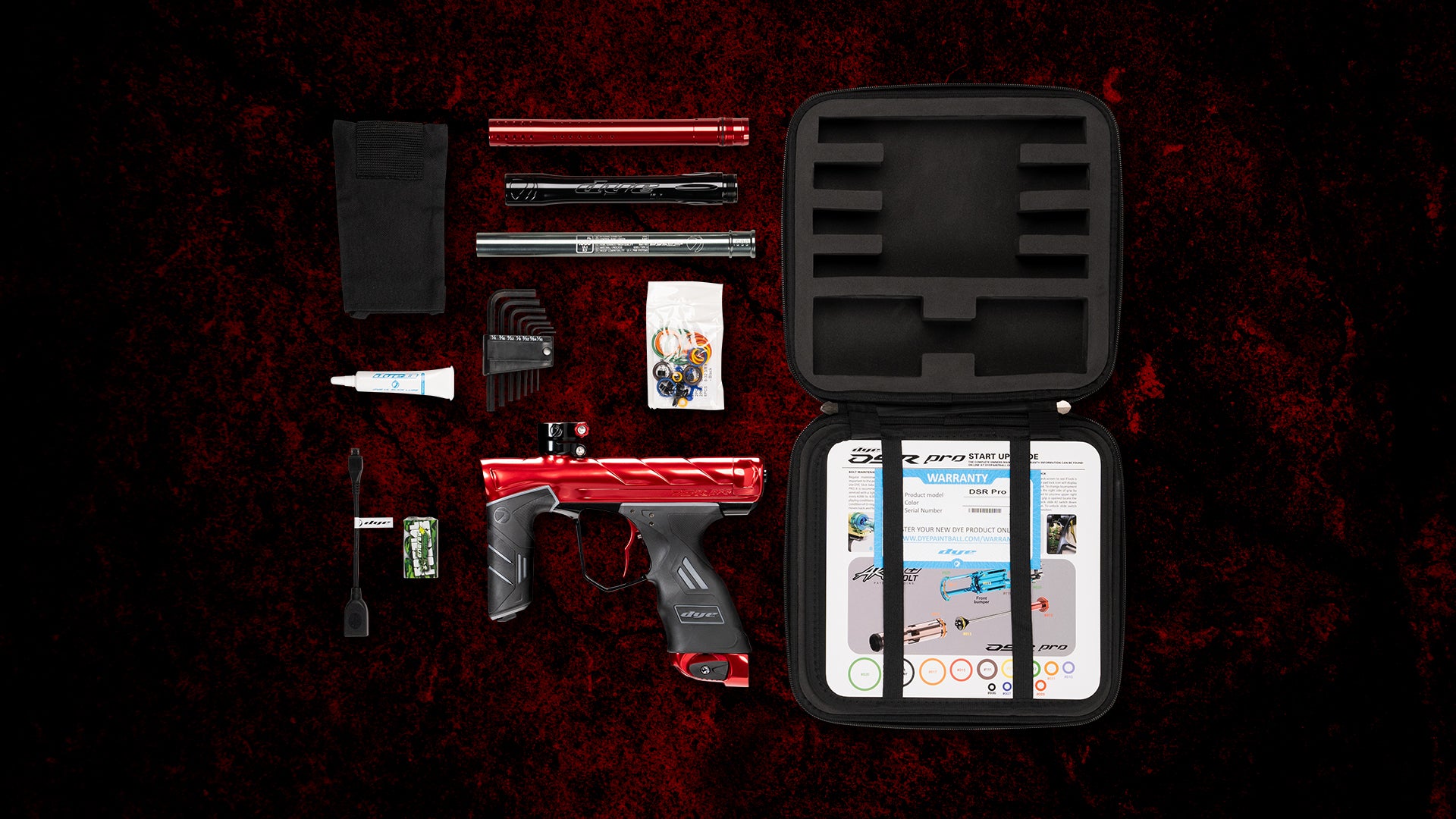 Features an EVA foam lining for secure protection of the DSR Pro. DYE Slick Lube Advanced, DSR Pro parts kit, quick-start guide, DYE Core Allen key set, 9-bolt battery, barrel sock and .688 UL-i aluminum insert are included with marker.